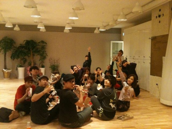 Hyomin tweeted the photo above,the girls are seen having snacks with other staff members.